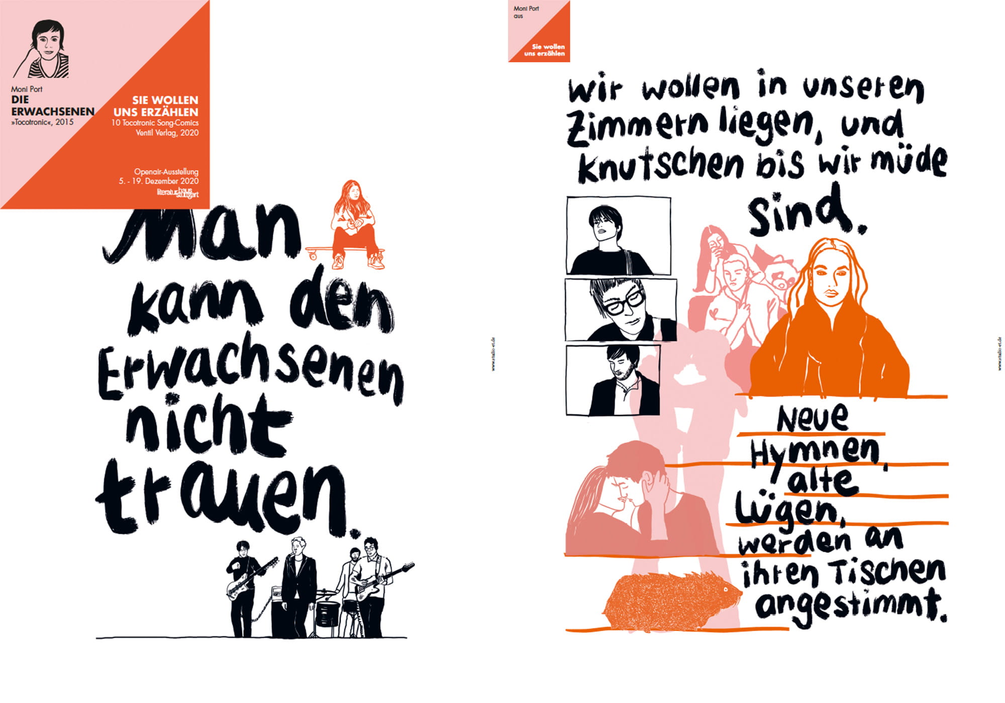 Das Buch „Sie wollen uns erzählen“ fängt die zahlreichen Facetten von Tocotronic ein: Zehn Songs aus der gesamten Schaffensphase werden von ausgewählten Comickünstler*innen und Illustrator*innen interpretiert. Im gezeichneten Songbook von Tocotronic haben sich Jim Avignon, Julia Bernhard, Tine Fetz, Eva Feuchter, Anna Haifisch, Sascha Hommer, Katja Klengel/Christopher Tauber, Moni Port, Jan Schmelcher und Philip Waechter je einem Tocotronic-Song angenähert, mal mehr Comic-Strip, mal mehr im illustrativen Stil. Herausgeber Michael Büsselberg, selbst Musikkenner und Comicfan, hat die die Idee des illustrierten Band-Songbooks aus der angloamerikanischen und französischen Popkultur »importiert« und kongenial auf seine liebste deutschsprachige Band adaptiert.