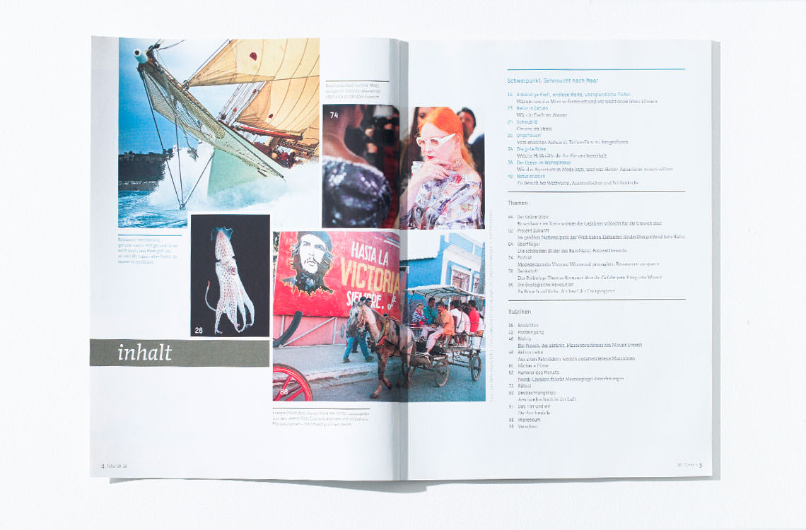 Der gedankliche Sprung, den man vom Artikeltext zu einem eingeschobenen Interview oder Kochrezept macht, findet hier eine optische Umsetzung. Im gesamten Layout zeigen die Bild- und Textanordnungen immer wieder Vielfalt und mögliche Bezüge auf.